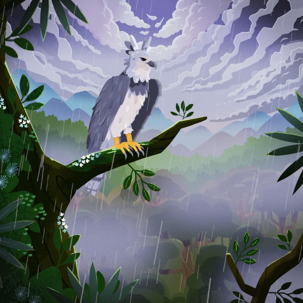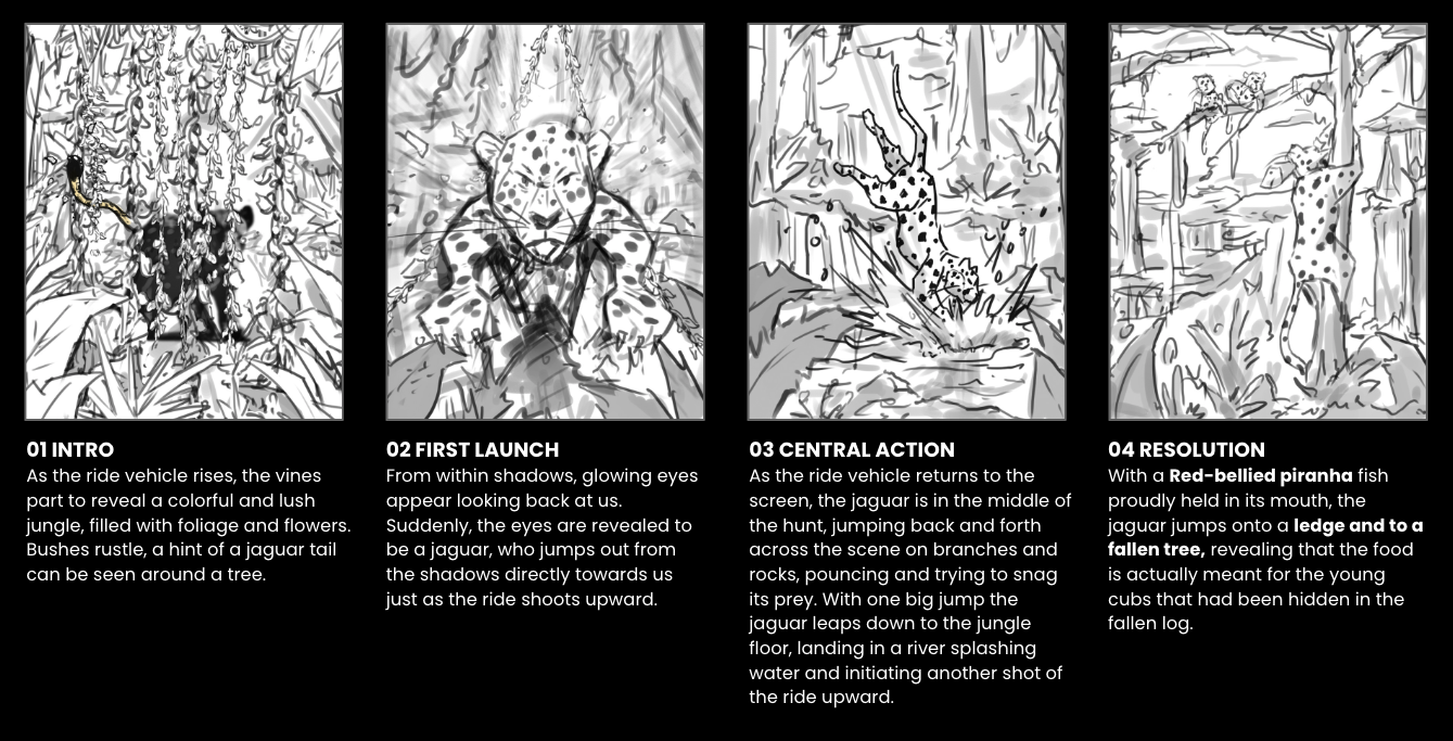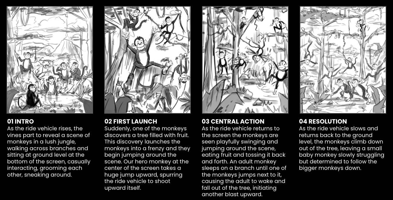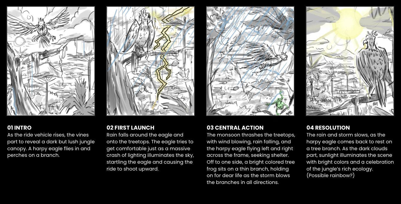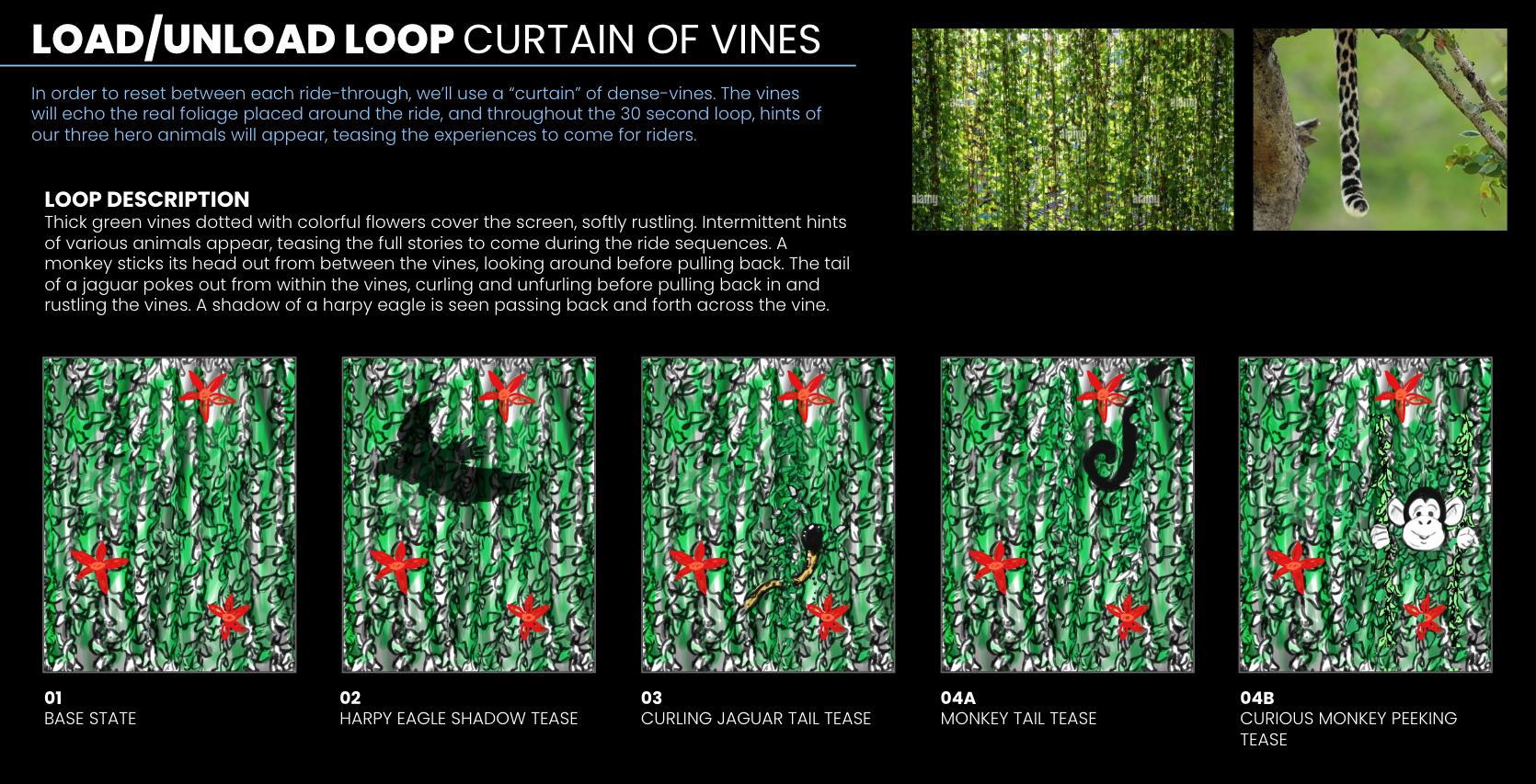 The centerpiece of the Wild Oasis transformation is Treetop Drop, a family drop tower refreshed with two massive LED screens that flank the ride structure. Spinifex Group was tasked with creating three distinct, randomized ride sequences to accompany the ride featuring a Harpy Eagle, Jaguar, and Monkeys. Stories and flows were designed to accentuate the thrills and motion of the gondola. To ensure the experience felt both fun and authentic, we collaborated closely with the park’s animal experts to ground our stylized animations and stories in reality. Beginning with storyboards and continuing into final production, we reviewed our content through POV mockups within a 3D model of the space, aiming to synchronize every wing beat and pounce to the physical "drops" and "climbs" of the tower, heightening the fun and thrill with our storytelling.