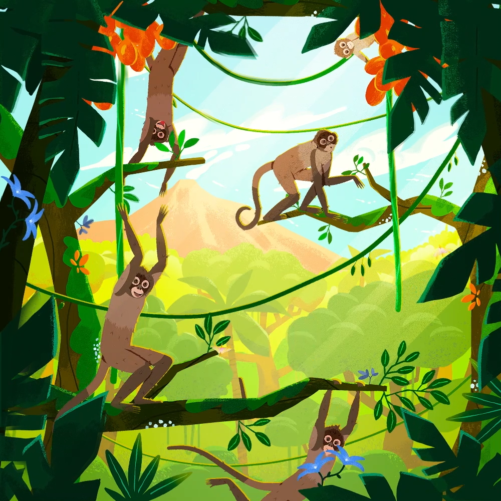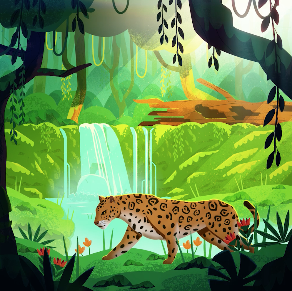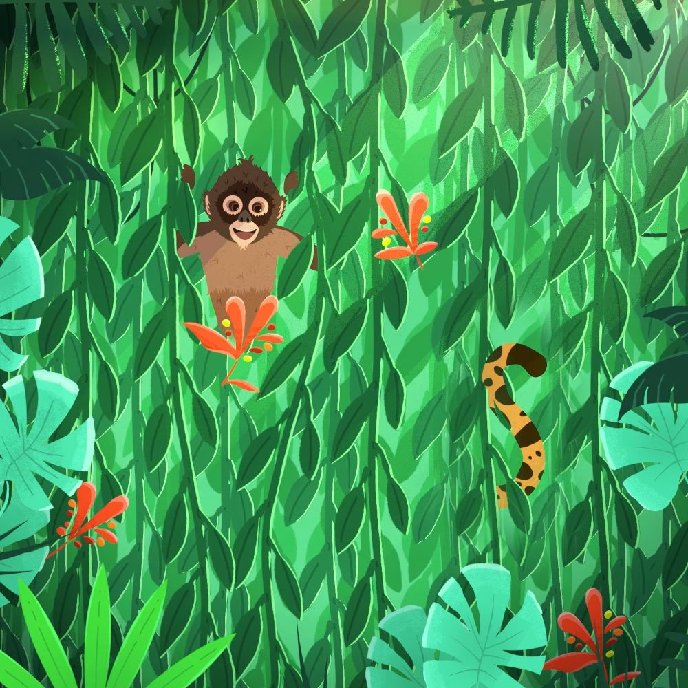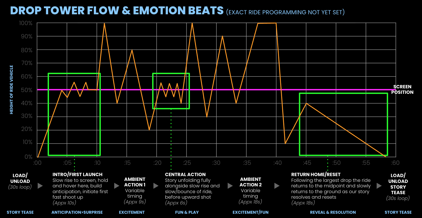The centerpiece of the Wild Oasis transformation is Treetop Drop, a family drop tower refreshed with two massive LED screens that flank the ride structure. Spinifex Group was tasked with creating three distinct, randomized ride sequences to accompany the ride featuring a Harpy Eagle, Jaguar, and Monkeys. Stories and flows were designed to accentuate the thrills and motion of the gondola. To ensure the experience felt both fun and authentic, we collaborated closely with the park’s animal experts to ground our stylized animations and stories in reality. Beginning with storyboards and continuing into final production, we reviewed our content through POV mockups within a 3D model of the space, aiming to synchronize every wing beat and pounce to the physical "drops" and "climbs" of the tower, heightening the fun and thrill with our storytelling.