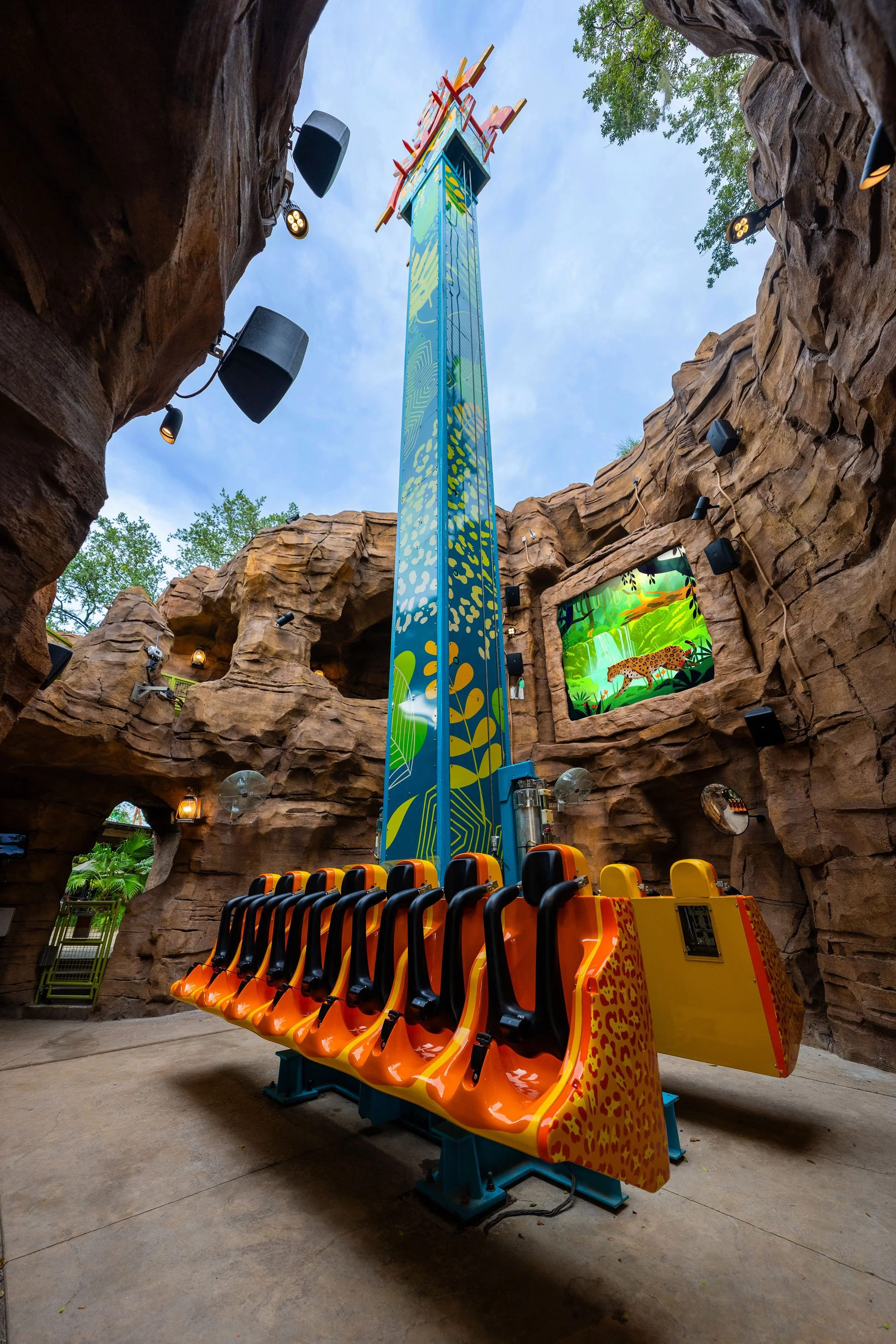 Busch Gardens Tampa Bay invites explorers of all ages to Wild Oasis, an immersive, kid-friendly adventure realm designed to entertain, educate and inspire! Multimedia immerses guests in the sounds and sights of the rainforest, anchored by the newly themed drop tower Treetop Drop. Custom media on either side of the tower shows one of three dynamic animal stories synchronized with the motion of the gondola. New music and sound effects throughout the realm come together with the vibrant placemaking to take family adventures to new heights!
